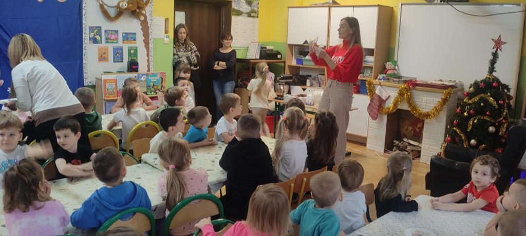 Tego dnia najmłodsi wysłuchali „Świątecznych opowieści” czytanych przez starszych kolegów z Samorządu Uczniowskiego- Zosię Mroczek i Janka Szelesta. Ich piękne czytanie, pełne ciepła i zaangażowania, zachęciło przedszkolaki do sięgania po książki i rozwijania wyobraźni. Wydarzenie było kolejnym działaniem promującym czytelnictwo wśród najmłodszych i pokazującym, jak wiele radości niesie wspólne czytanie.