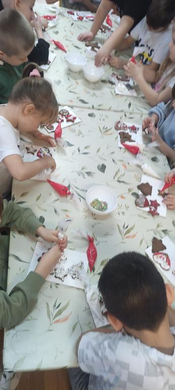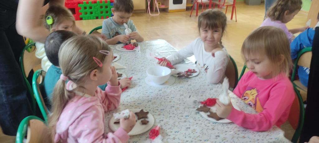 W czwartek 11 grudnia w naszej przedszkolnej Fabryce Pierników w Małaszewiczach w powietrzu nadal unosił się zapach korzennych przypraw, lukru i dziecięcej radości. Przedszkolaki zebrały się w sali Galaktycznej Drużyny, gdzie czekały na nie upieczone dzień wcześniej pierniki- jeszcze ciepłe wspomnieniem wczorajszego wypiekania i gotowe, by nabrać kolorów dzięki małym artystom.