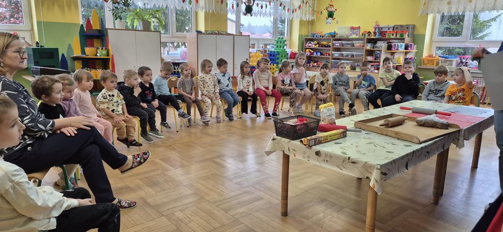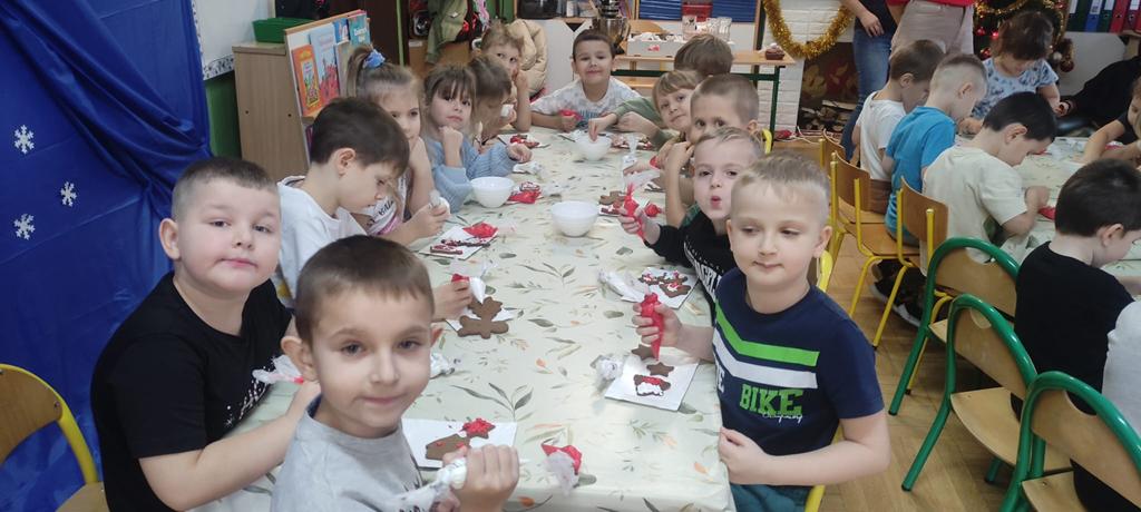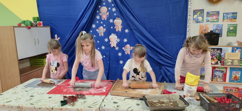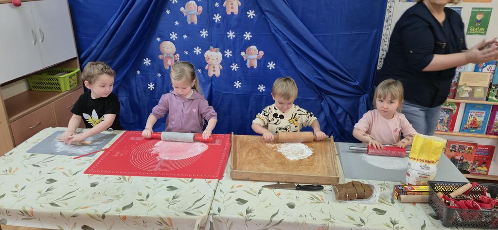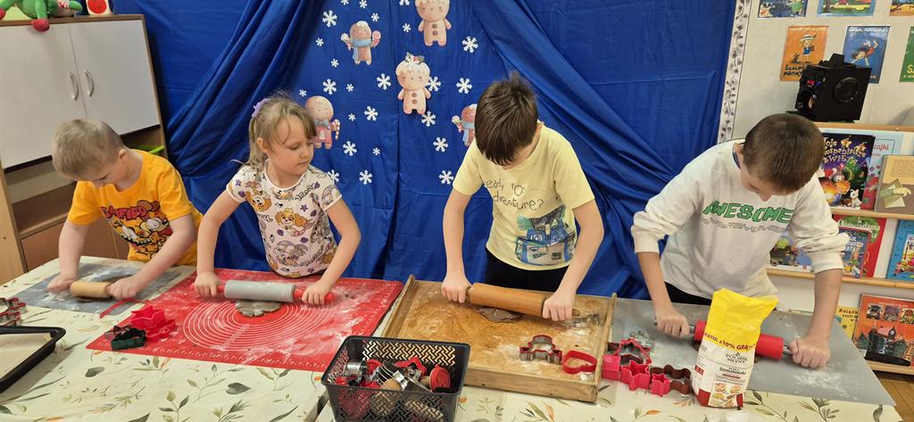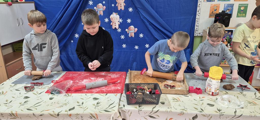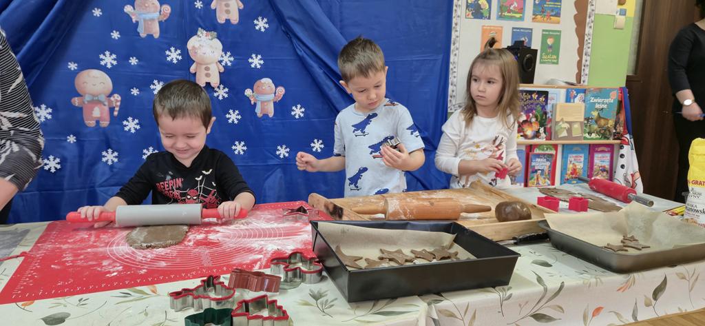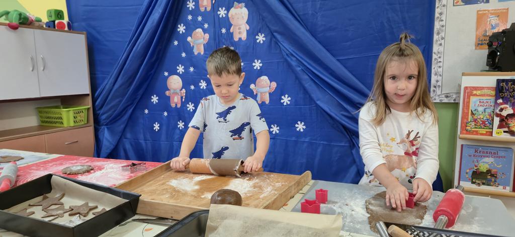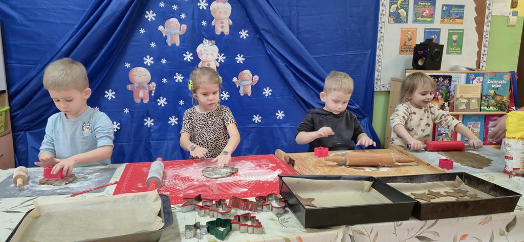Maluszki i starszaki z niezwykłym zapałem zagniatały ciasto, wałkowały je i wykrawały foremkami przeróżne kształty. Każdy pierniczek był wyjątkowy, przygotowany małymi dłońmi z pełnym zaangażowania uśmiechem. Wspólne pieczenie stało się nie tylko zabawą, ale też piękną lekcją świątecznych tradycji, przypominając, że magia Bożego Narodzenia kryje się w prostych chwilach spędzonych razem.
